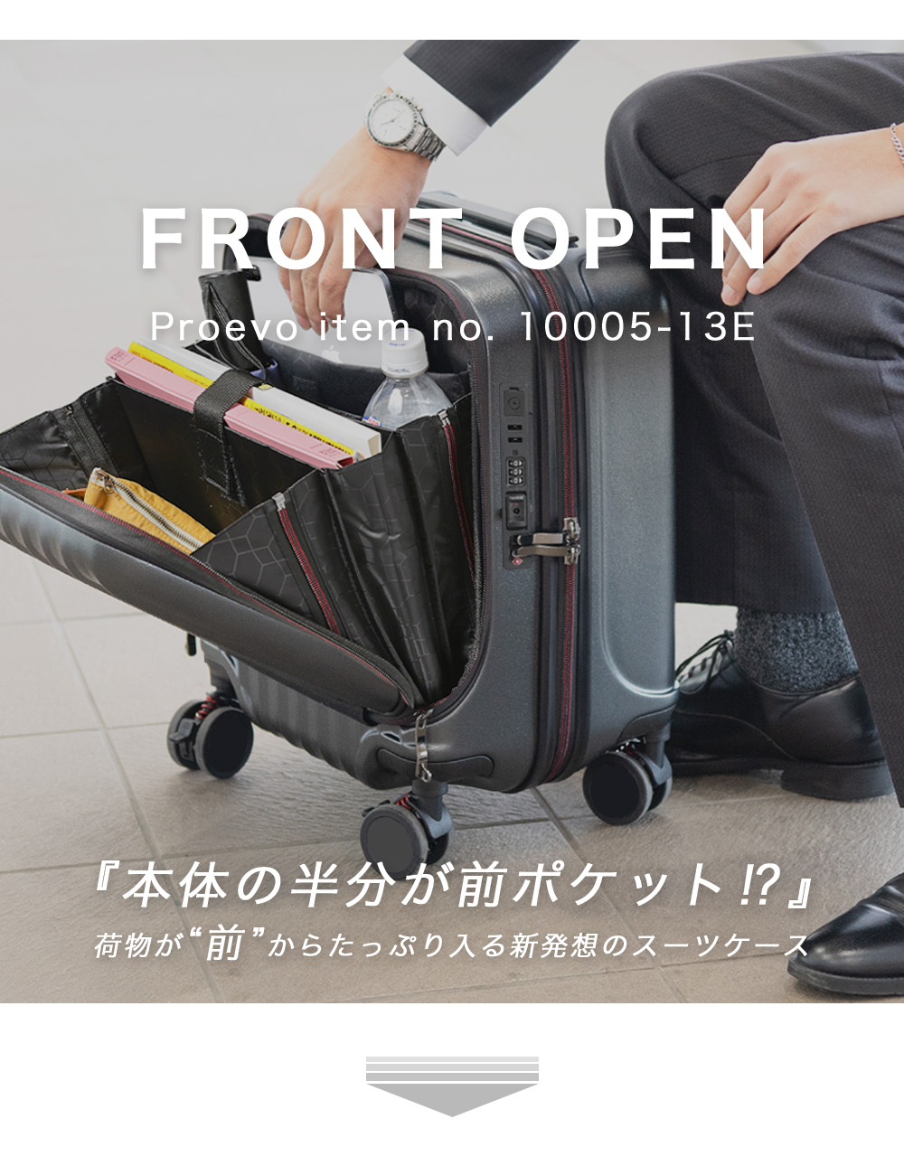 [Proevo(プロエボ)]のフロントオープン型スーツケースです。