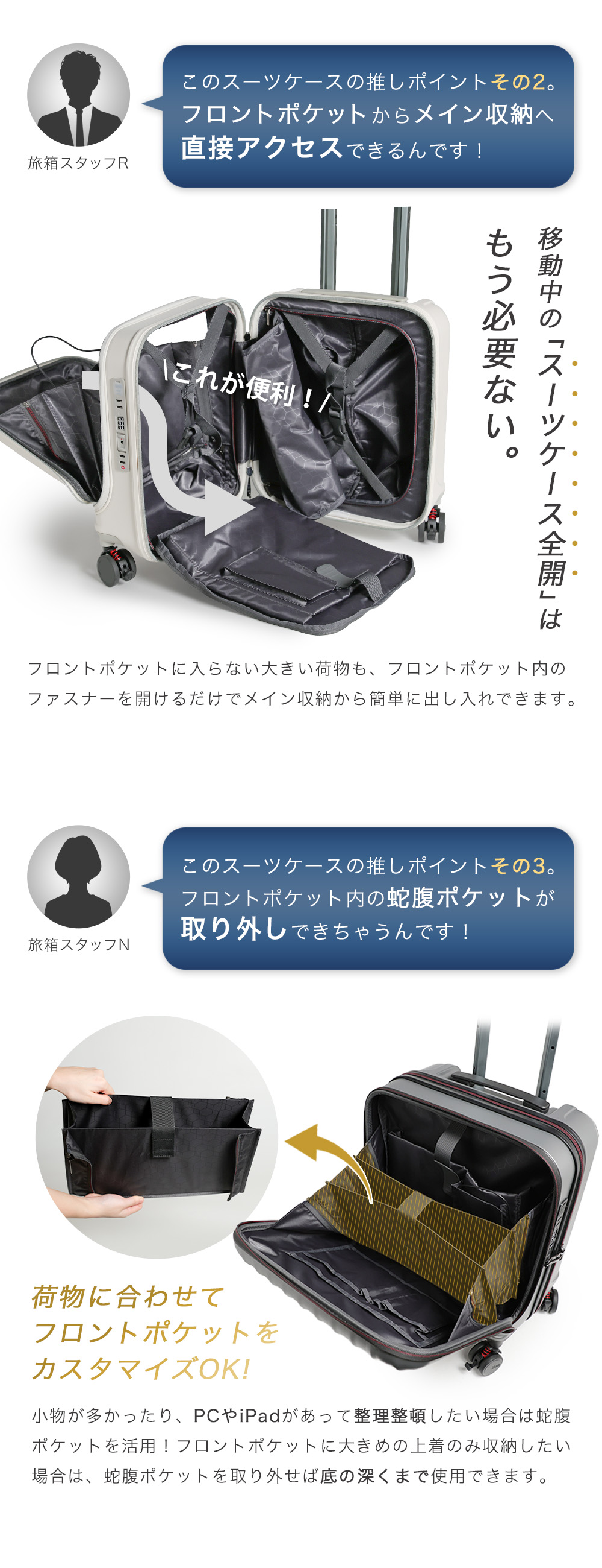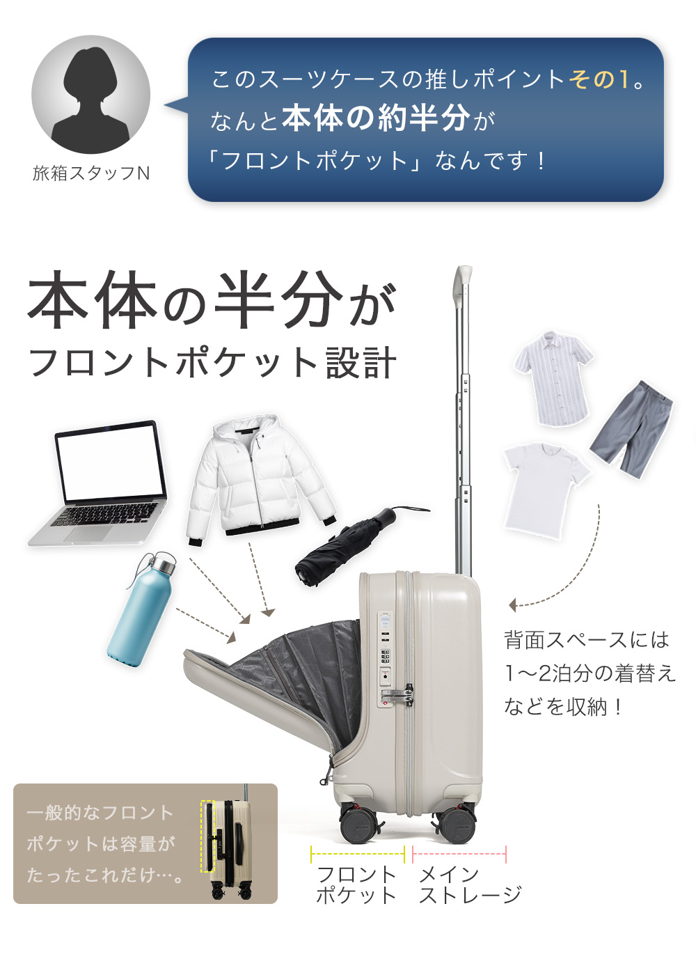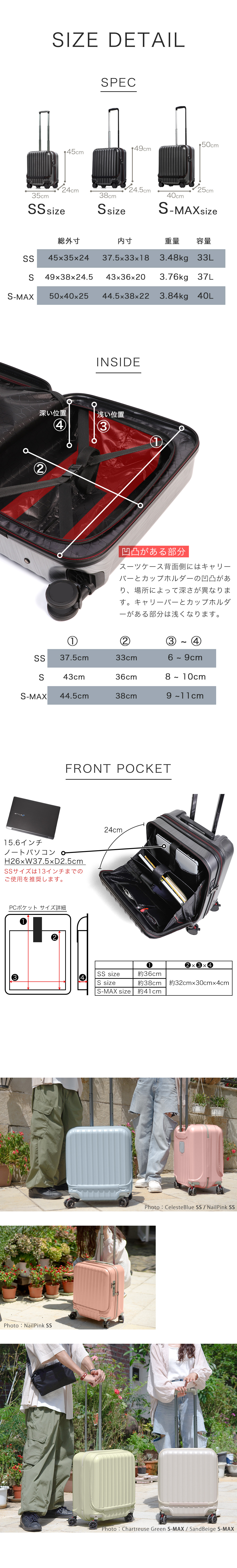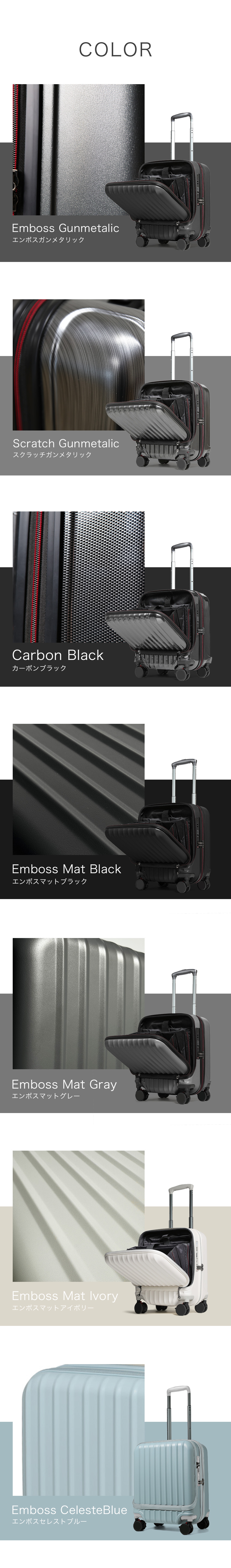 機内持ち込み対応サイズで、フロント部分には移動中に出し入れしたいものを収納できるので、ビジネスシーンや旅行など様々なシーンで大活躍です。