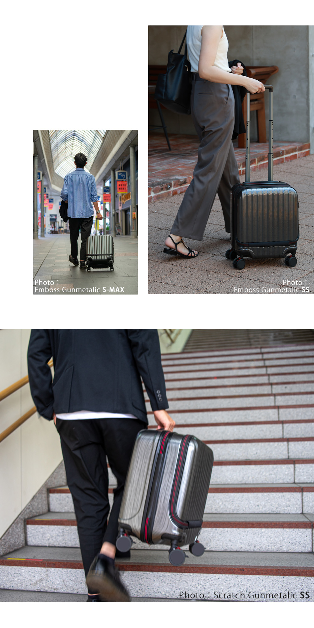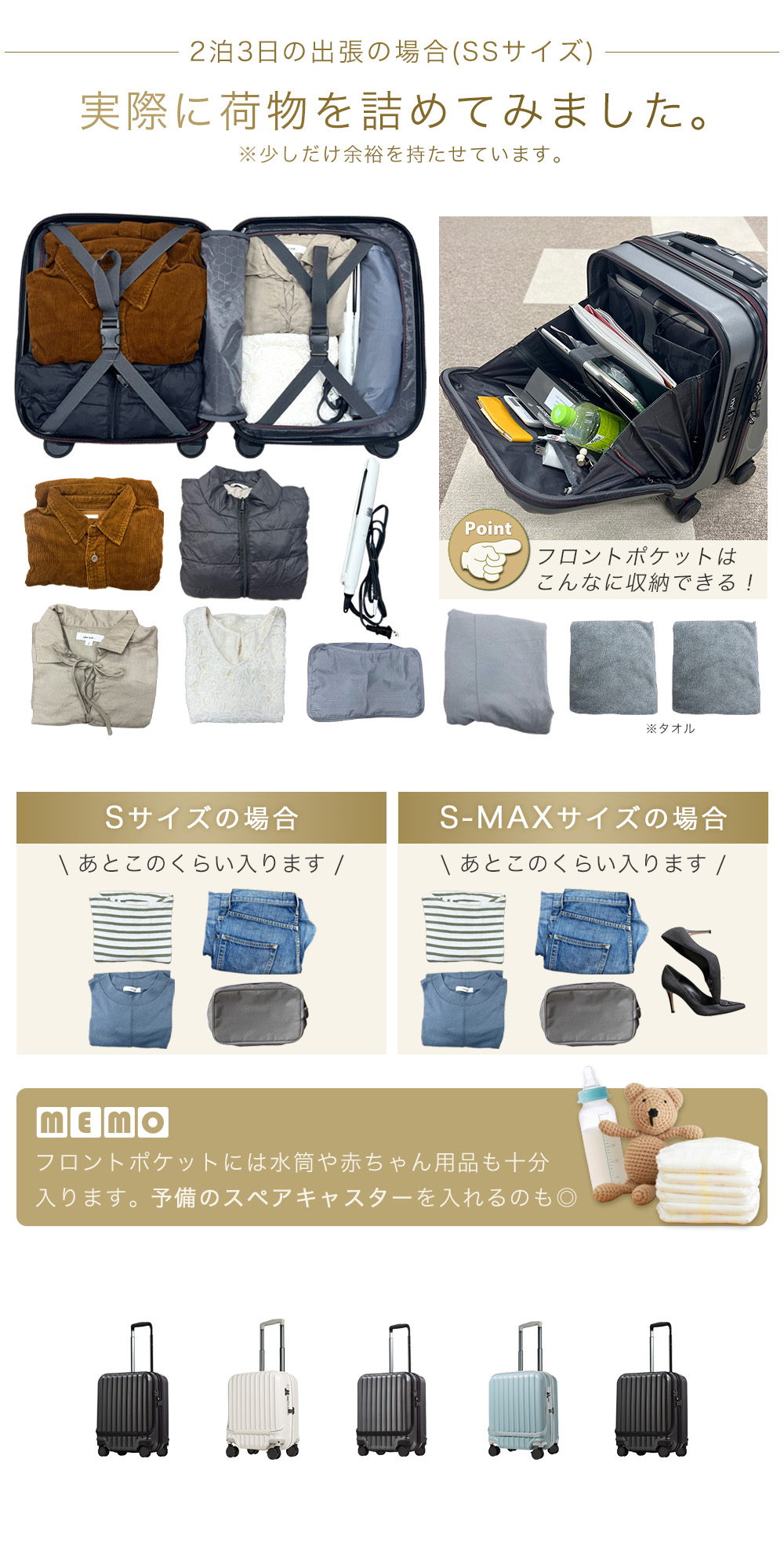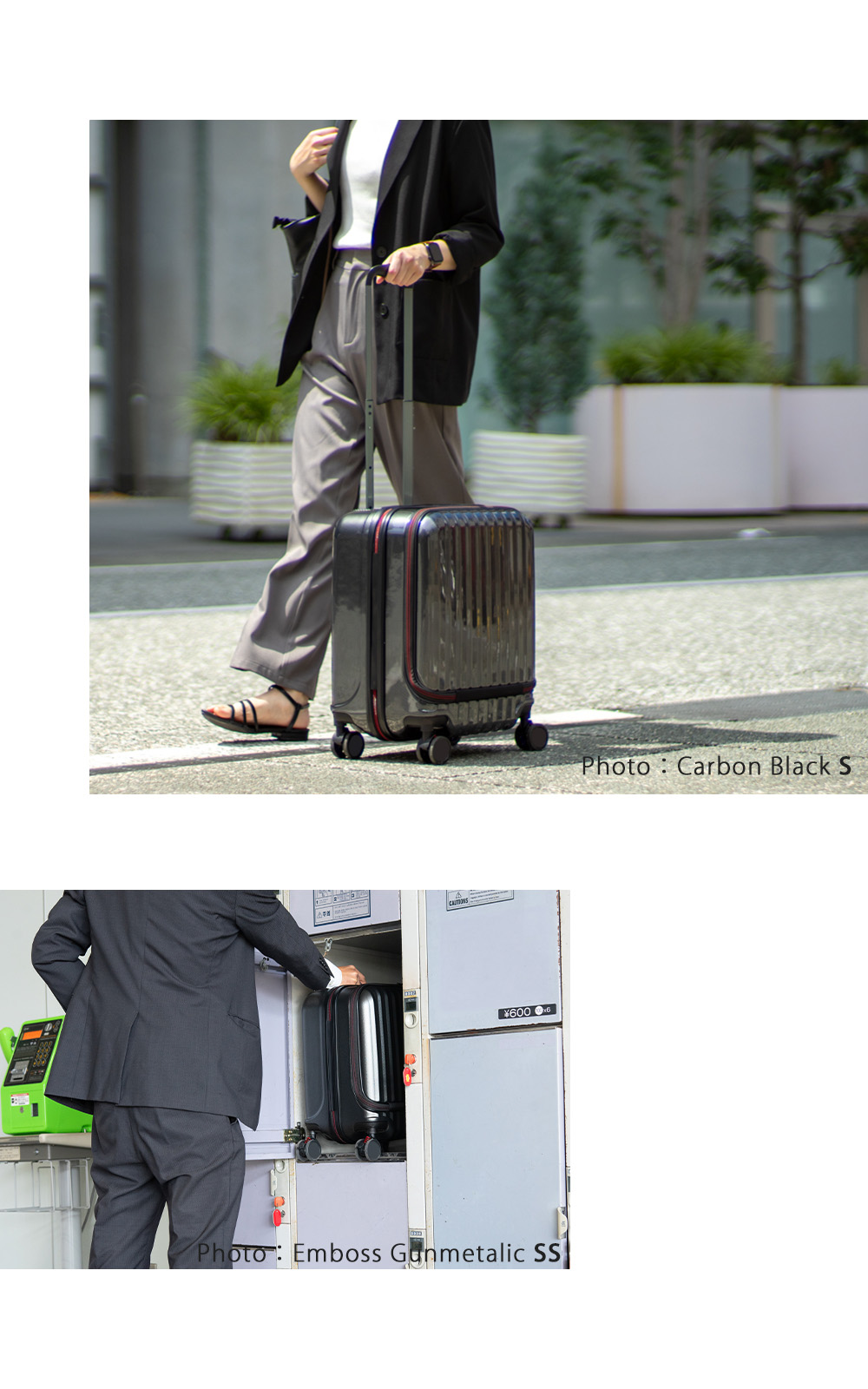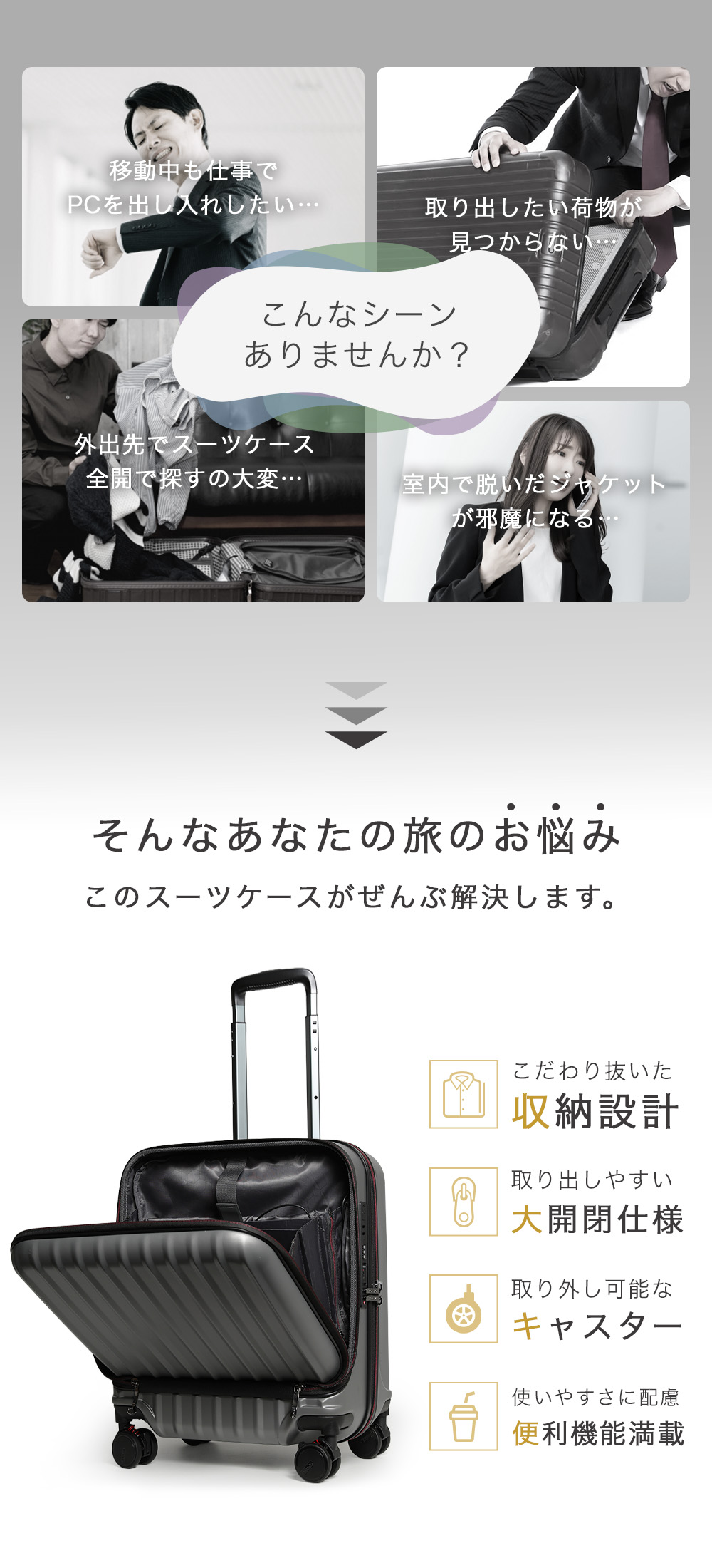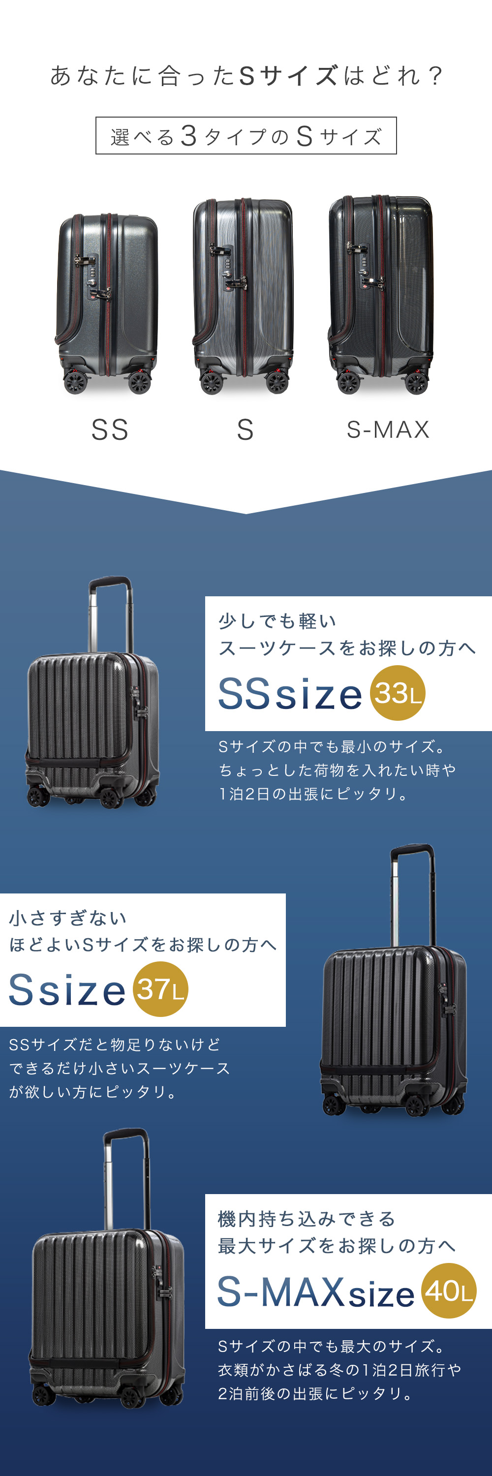 機内持ち込み対応サイズで、フロント部分には移動中に出し入れしたいものを収納できるので、ビジネスシーンや旅行など様々なシーンで大活躍です。