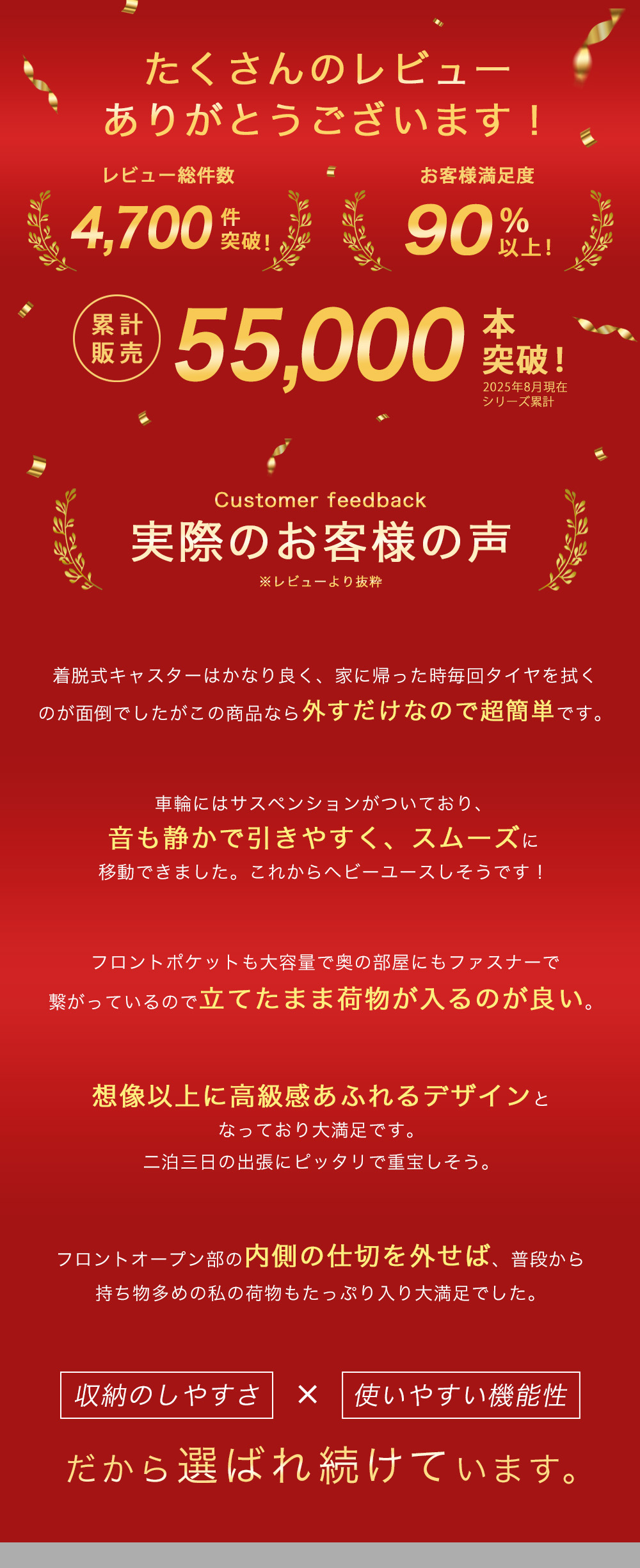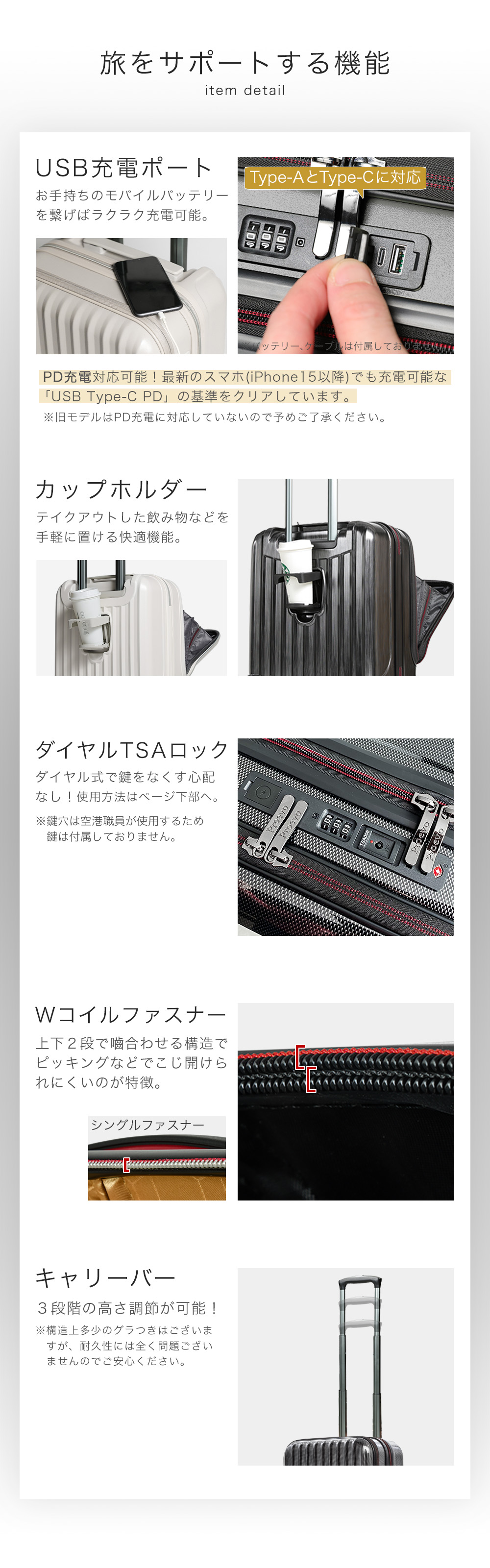 ストッパー付き静音キャスターやTSAロックなど機能性も十分!